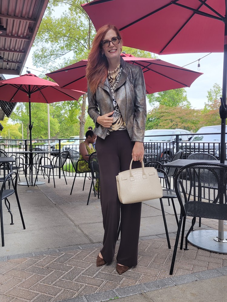 Also, remember, the Liquid Leather jacket. Here I am wearing the Copper Liquid Leather jacket from Clara Sunwoo, giving that metallic look something special with this neutral palette. If you didn’t know, the liquid leather jackets are all knits, and cam be washed and worn, which certainly beats visits to the dry cleaner! There are many styles from bombers to motorcycle jackets to the classic shapely jacket CSW offers in so many colors.